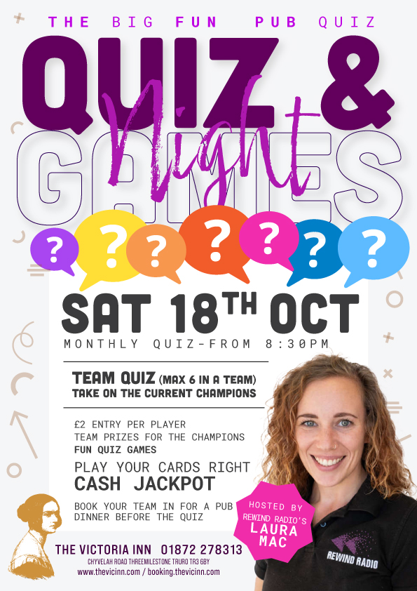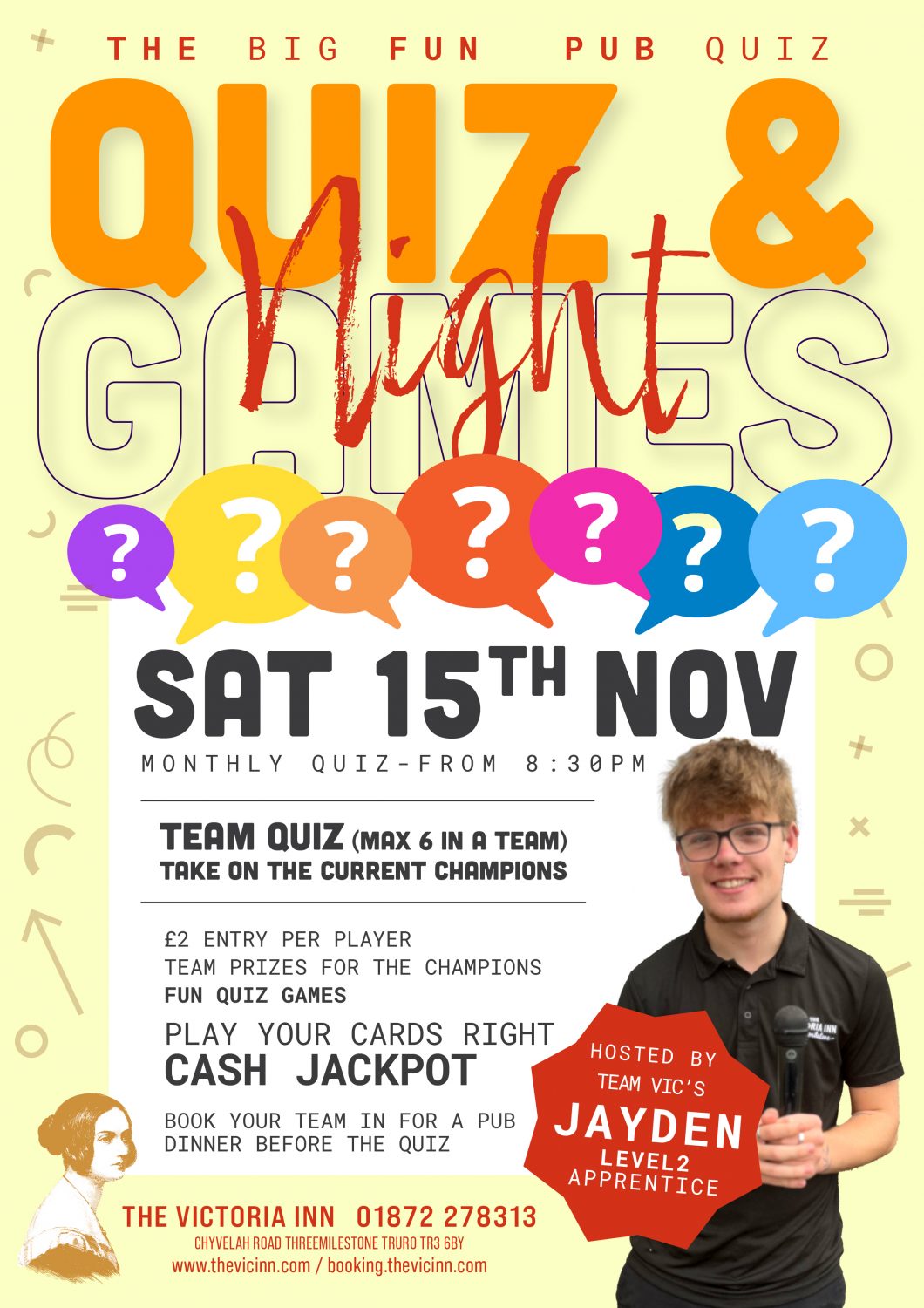 Join team Vic for the big fun quiz with a chance to return to next months quiz on the champions table – which includes your food and fizz.